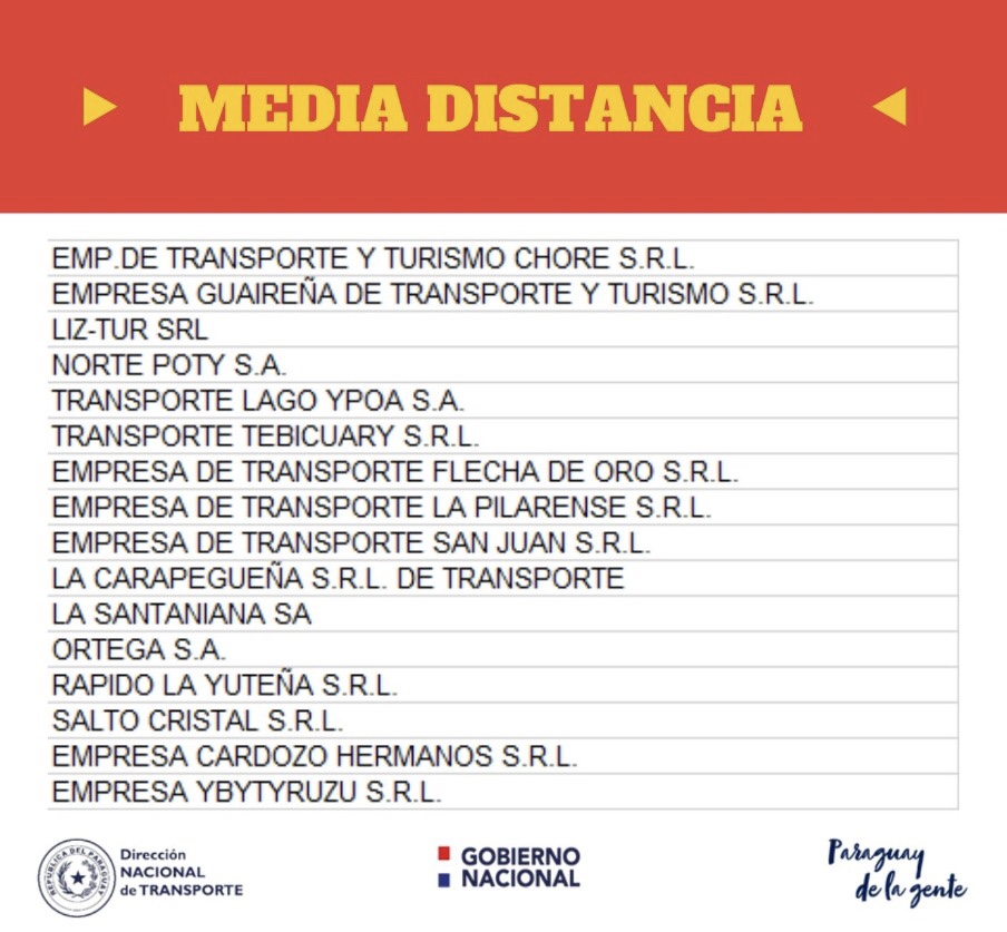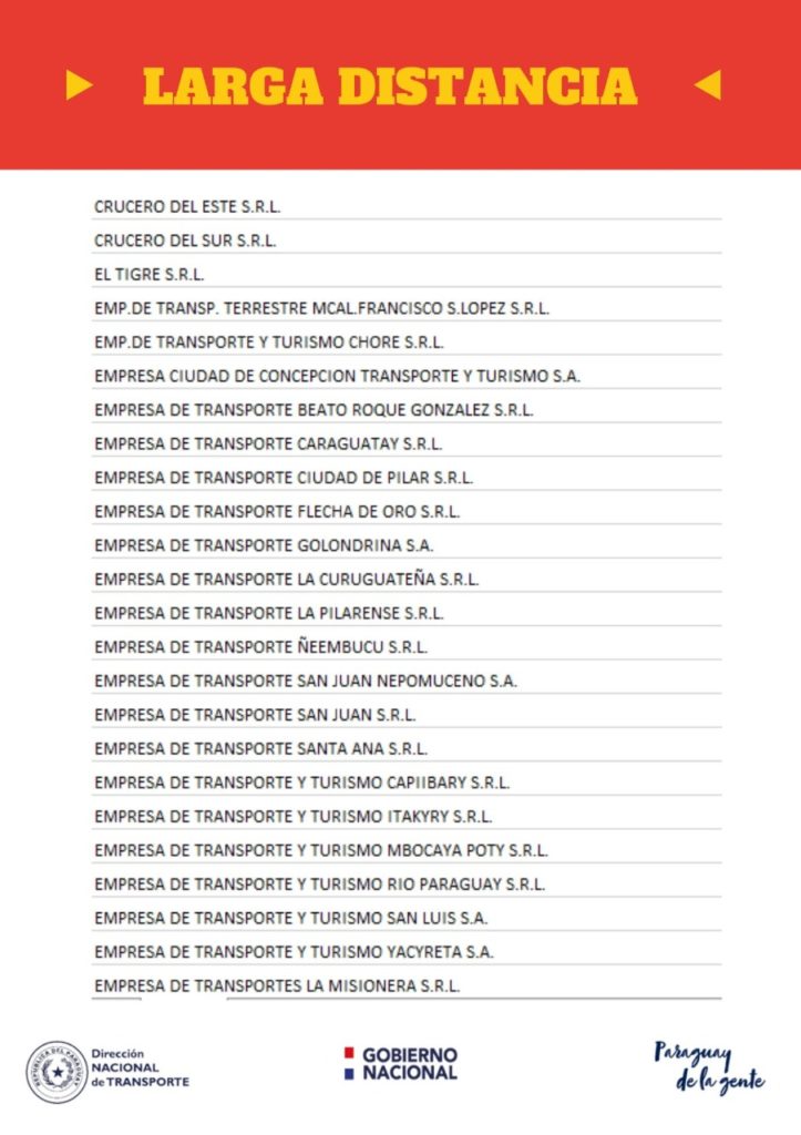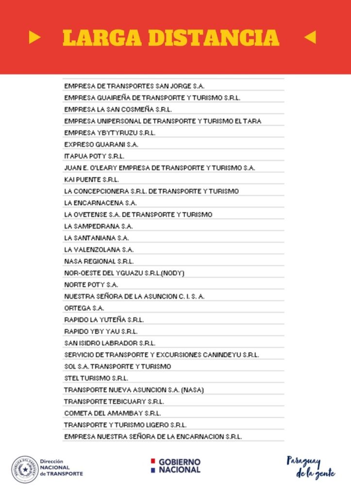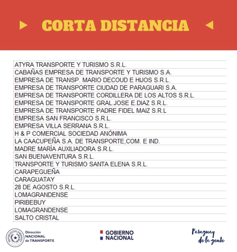 Un total de 92 empresas del transporte que prestan servicio de corta, media y larga distancia están afectados por la Resolución 157/2020 de la Dirección Nacional del Transporte (Dinatran) que responde a las medidas del Gobierno Nacional en el marco de la Ley N. º: 1.590/2000 para evitar la propagación del “Covid – 19”.