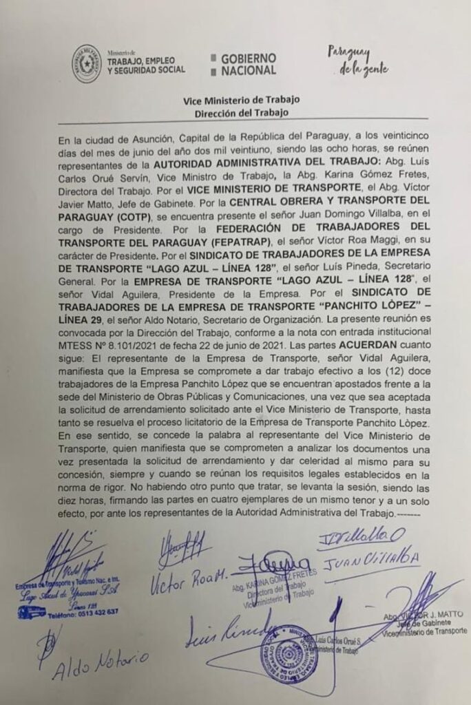 Son firmantes del acuerdo también representantes del Ministerio del Trabajo, Central Obrera y Transporte del Paraguay (COTP), Federación de Trabajadores de Transporte del Paraguay (FEPATRAP), Empresa de Transporte Lago Azul – Línea 128, Sindicato de Trabajadores de la Empresa de Transporte Lago Azul – Línea 128 y sindicato de Trabajadores de la Empresa de Transporte Panchito López – Línea 29.