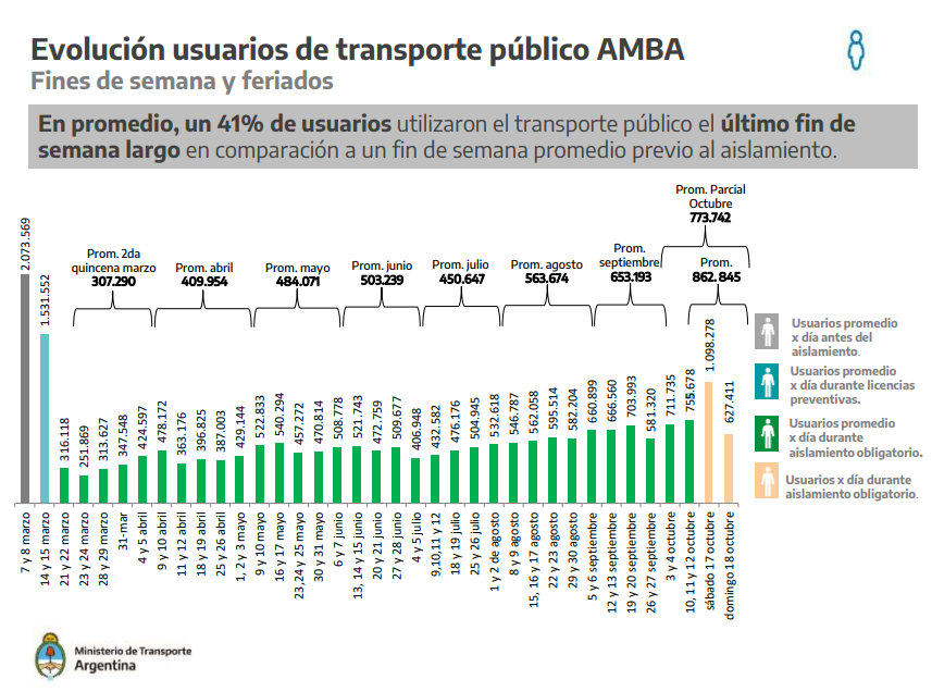 ✅ El fin de semana pasado circularon en promedio 862.845 usuarios en transporte público en el Área Metropolitana de Buenos Aires.