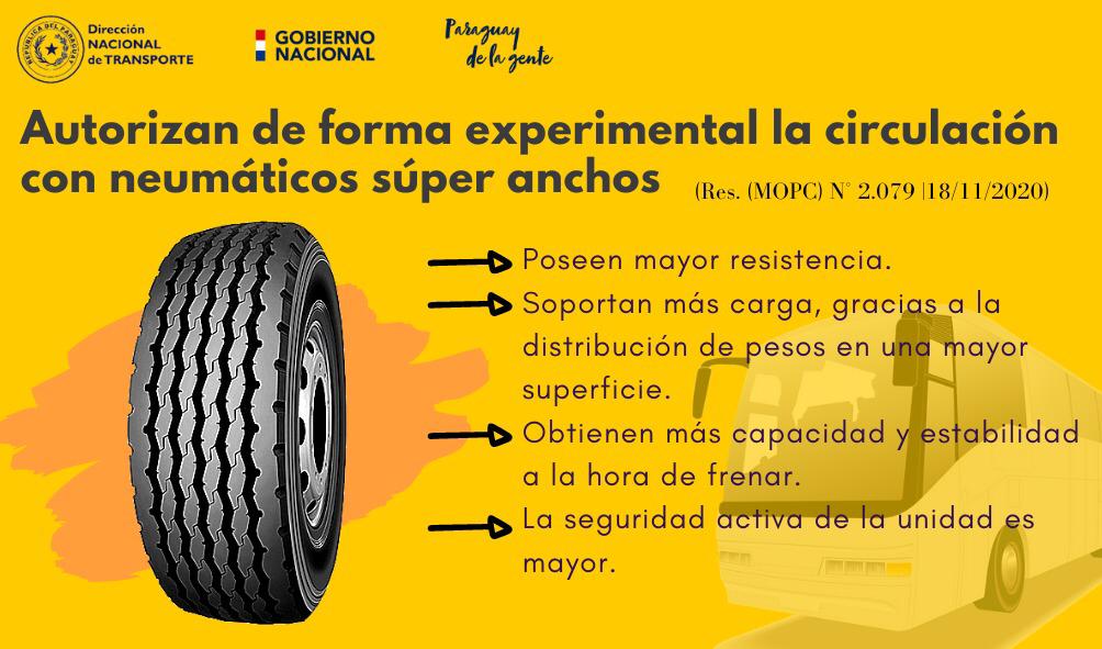 Unidades del transporte de pasajeros podrán circular con neumáticos súper anchos, mediante una autorización en forma experimental otorgada por el Ministerio de Obras Públicas y Comunicaciones, según la Resolución N° 2.079, del 18 de noviembre pasado.