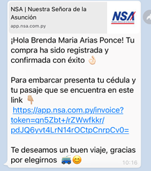 También a tener en cuenta que en los viajes de IDA y VUELTA, si realizas la compra de ambos pasajes al mismo tiempo te llega al WhatsApp un link donde estarán detallados ambos pasajes. Nuestra Señora de la Asunción ya no imprime boletos, son todos tickets son digitales y te llegan al WhatsApp.