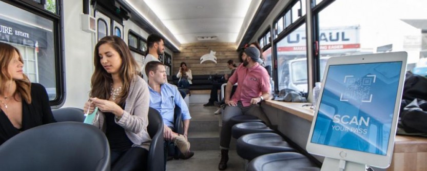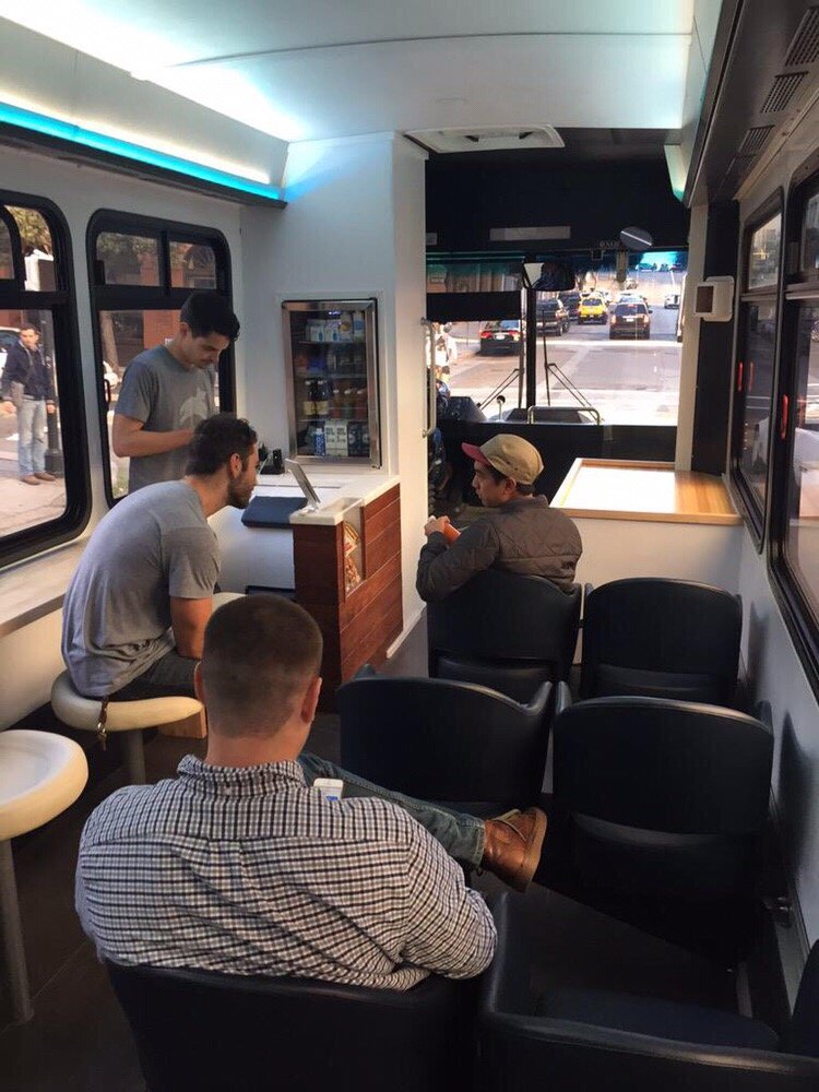 Así que a pesar de que ya había oído cosas terribles sobre Leap, incluida su política de no admitir personas discapacitadas y niños en sus buses, tenía la mente abierta. Me dirigí al centro para tomar el bus nocturno hacia el Puerto Deportivo. El servicio tiene solo un mes de antigüedad, definitivamente en beta, así que solo tienen esta ruta entre el vecindario de la bahía de San Francisco y el centro del distrito financiero. Y sí, es costoso (para registrarse en el servicio, usted pre-paga por tres de esos viajes de seis dólares, con café y aperitivos costando extra.)”