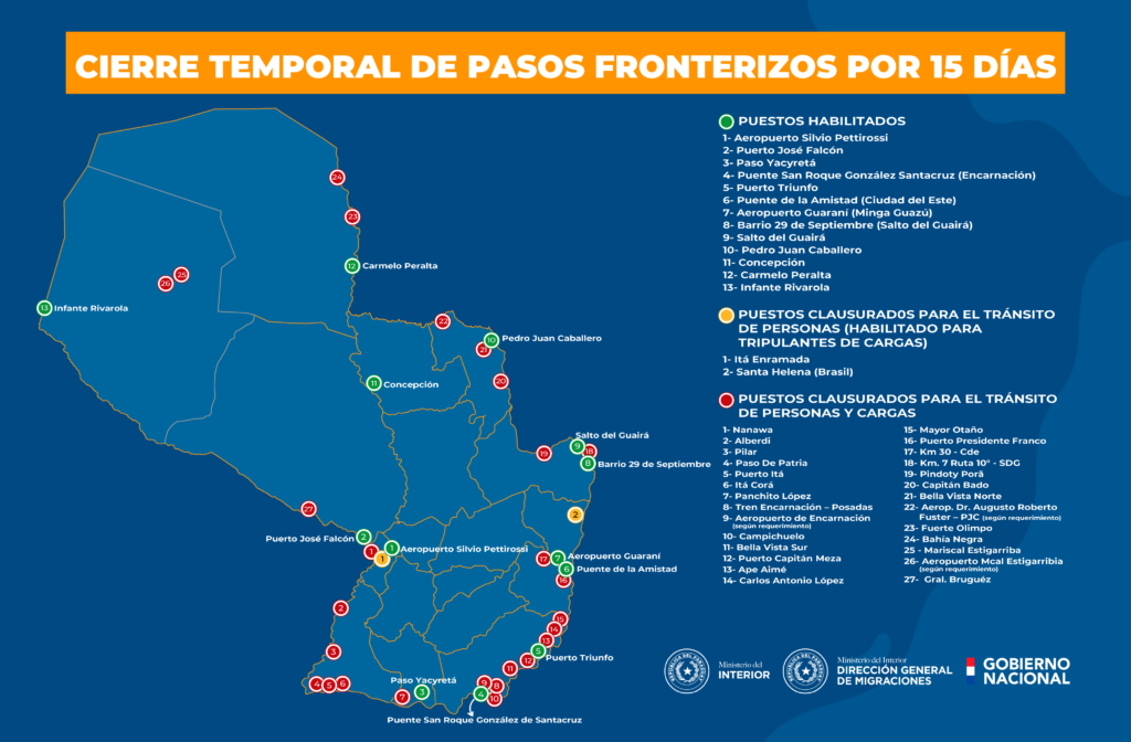 El día 16 marzo la Dirección General de Migraciones dispone cierre parcial de las fronteras con los países vecinos, Argentina, Brasil y Bolivia quedando operativo el 30% de los puestos de control migratorio (13 de los 42 puestos) El transporte internacional de pasajeros ha quedado totalmente suspendido desde aquel momento hasta el día de la fecha.